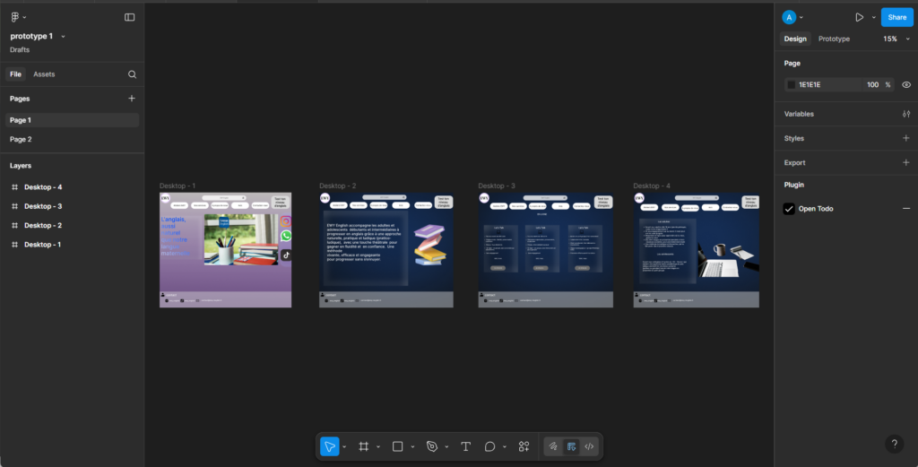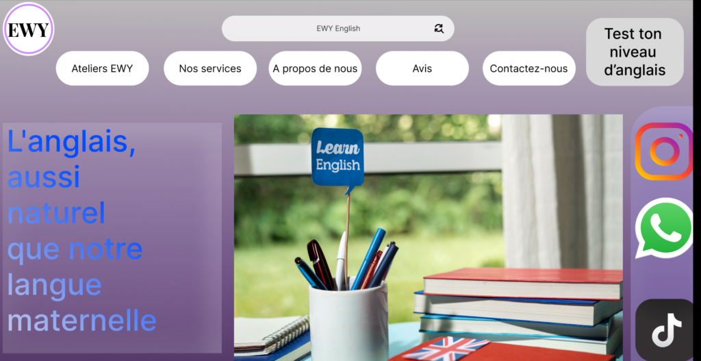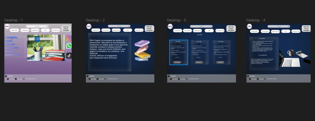 Dans mon exemple de mise en page, j’ai appliqué de façon cohérente les règles que j’ai établies, avec une hiérarchie visuelle claire et un message fort que j’ai développé : « L’anglais, aussi naturel que notre langue maternelle ». Cette phrase résume bien le positionnement que j’ai voulu donner à la marque.